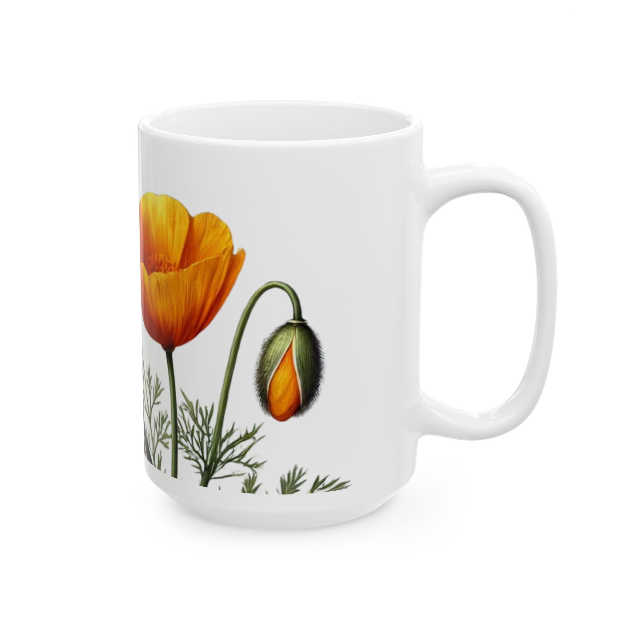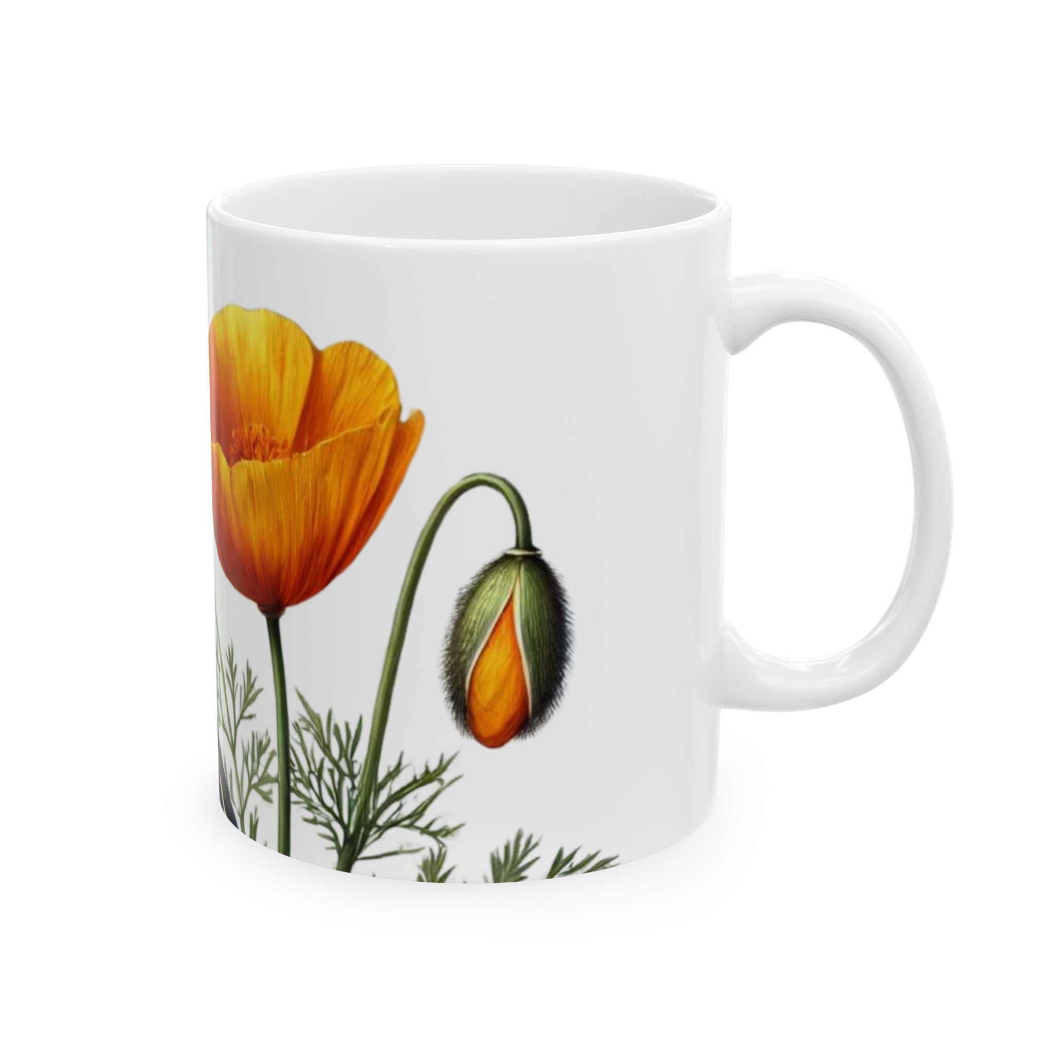 Warm mornings become a little gentler with this glossy ceramic mug. A hand-illustration style quail and bright orange poppies wrap around the white surface, bringing a quiet garden moment to your countertop. The smooth C-handle sits comfortably in hand while the vibrant print keeps its color through daily use. Use it for slow coffee, herbal tea, or a soothing hot chocolate and let the calm, nature-inspired scene be a small ritual between sips.