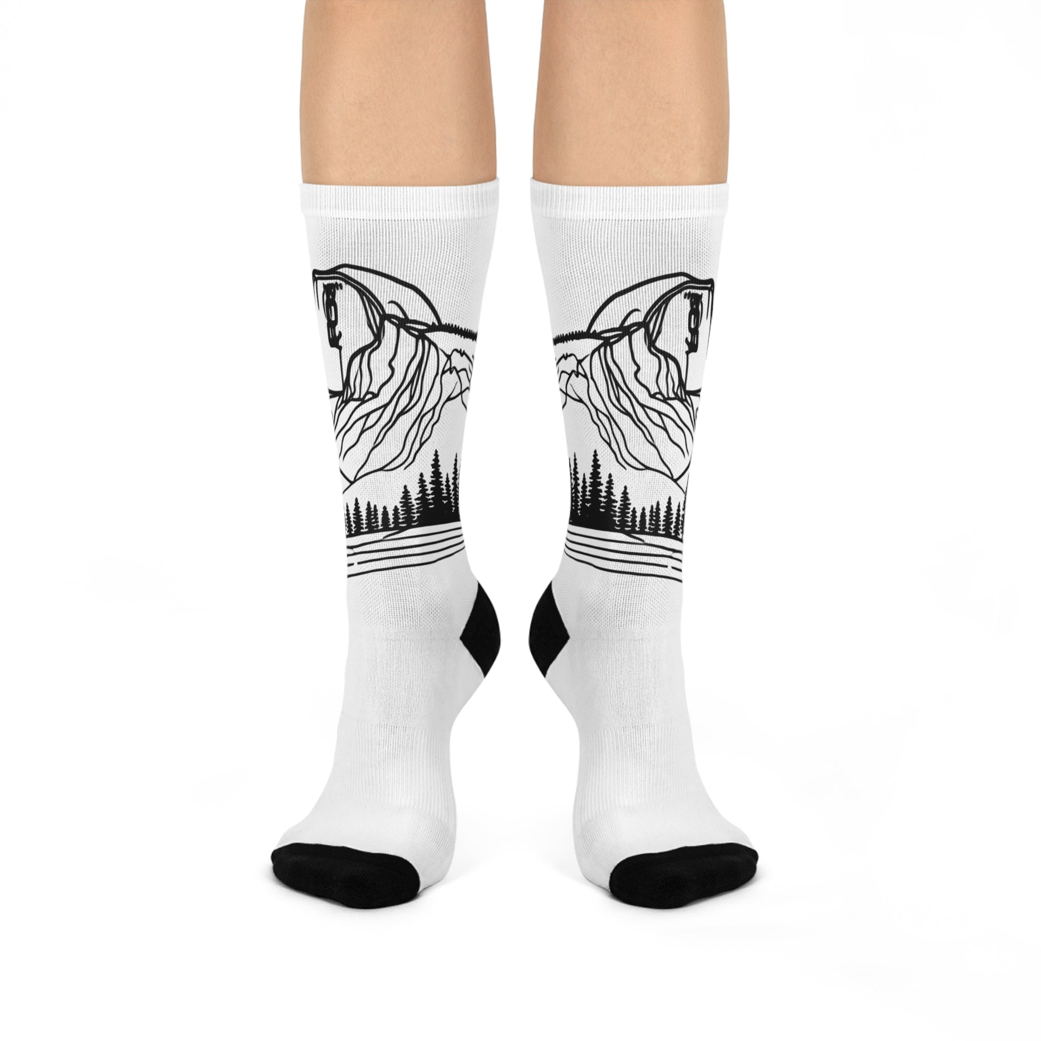 Experience the great outdoors with these cushioned crew socks featuring a half dome line art of Yosemite mountain. Perfect for outdoor enthusiasts, hikers, and nature lovers. Ideal for wearing on casual outings, hikes, or as a statement piece for your activewear. Celebrate nature and adventure with these vibrant and stretchy socks.