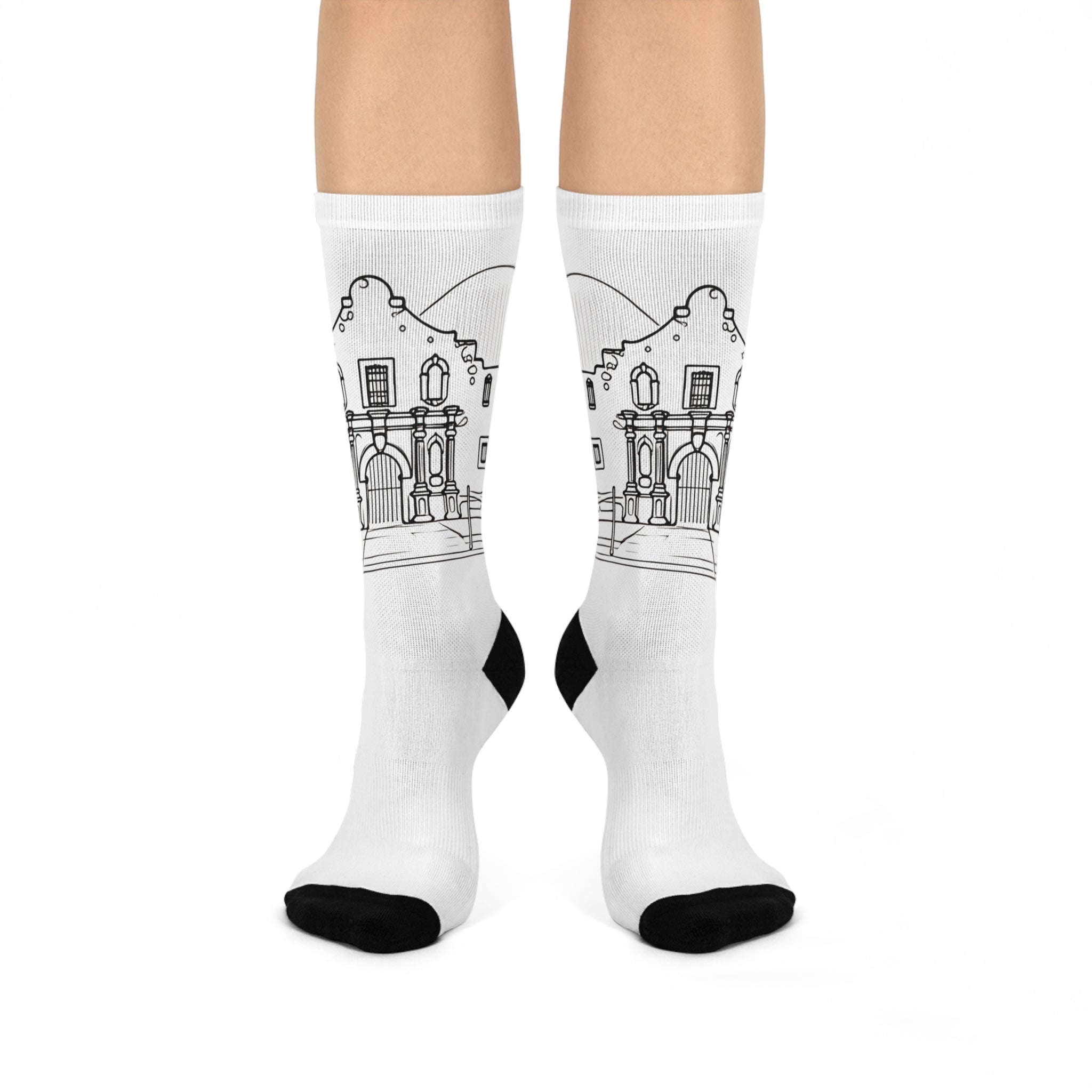 Minimalist Texas Alamo Mission graphic socks, perfect for those who love the Southwest and historical landmarks. Ideal for casual, dress, or activewear, these vibrant crew socks are a great gift for anyone who appreciates Texas history.