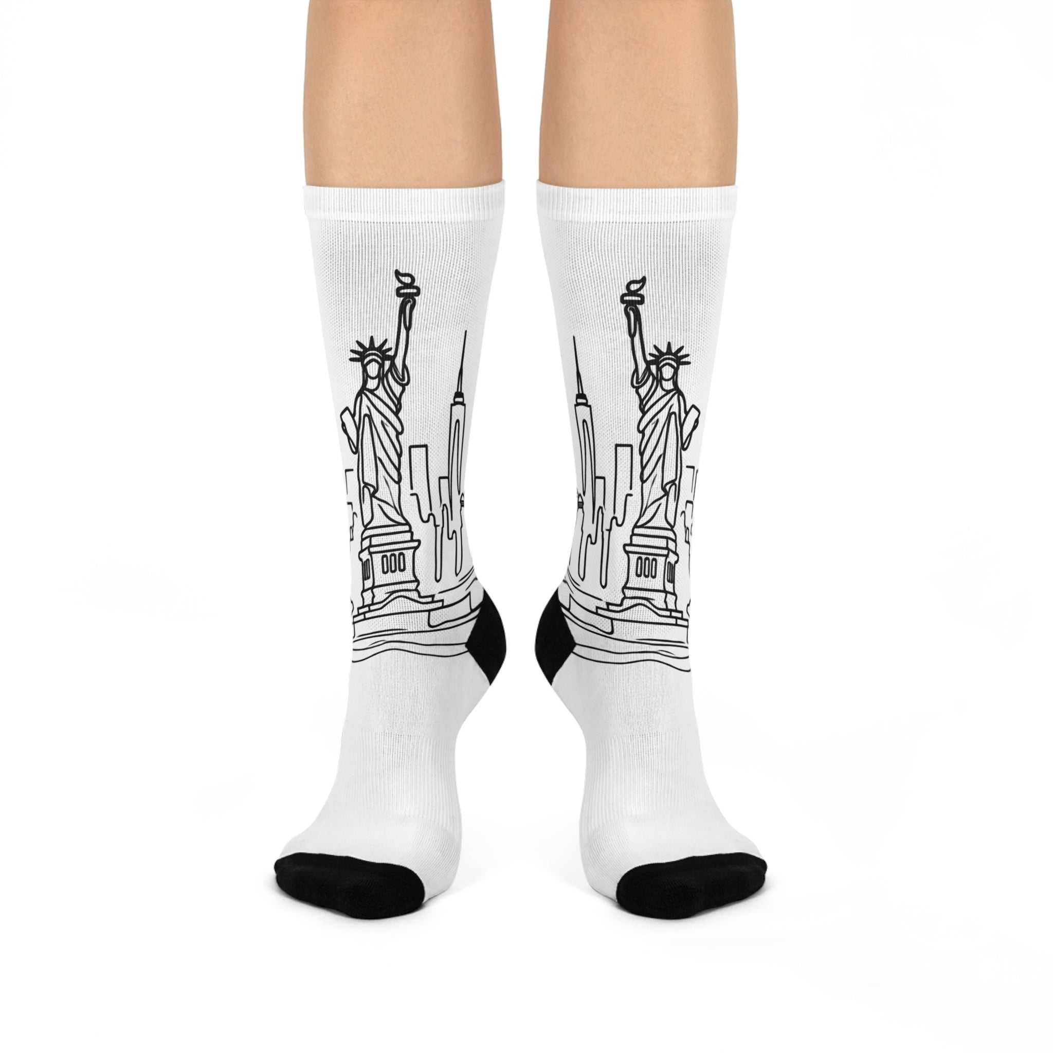 These New York City skyline continuous line art cushioned crew socks feature a minimalist Statue of Liberty design, perfect for those who love the NYC vibe. Ideal for casual or activewear, these vibrant socks are great for anyone who adores the Big Apple. Relevant for holidays like Fourth of July or for travelers and city lovers alike.